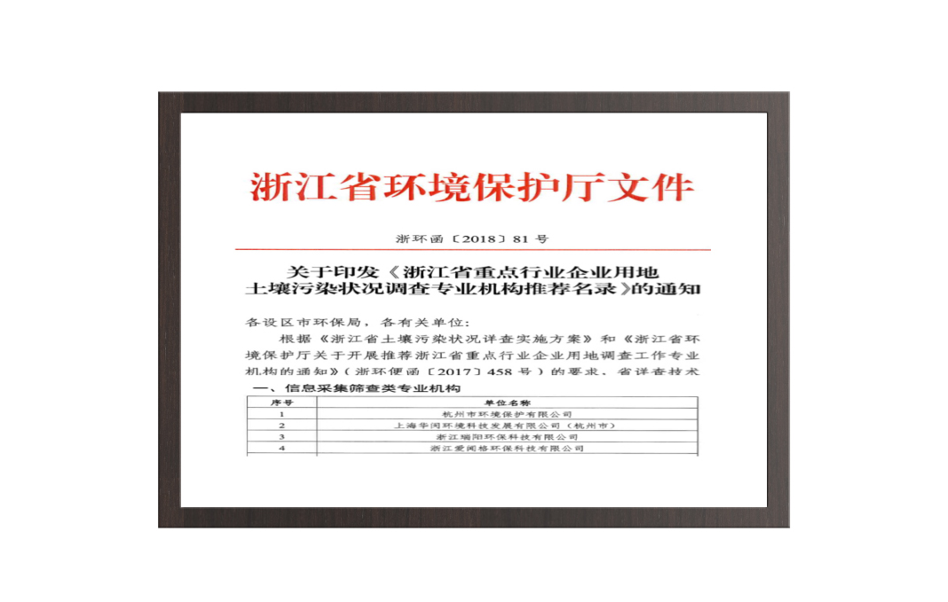 公司擁有環境保護部環境影響評價資質、浙江省建設項目環境監理甲級資質、浙江省污染防治工程設計能力證書、浙江省污染防治工程總承包能力證書,浙江省污染場地環境風險調查評估能力證書,入圍浙江省重點行業企業用地土壤污染狀況調查專業機構推薦名錄,同時,公司擁有污染防治工程設計多項專利和計算機軟件著作權等。